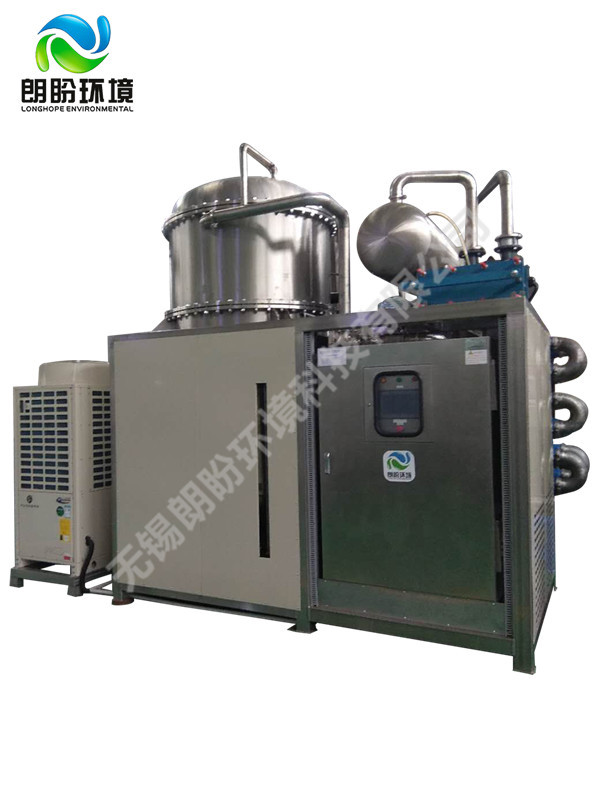 熱泵濃縮蒸發器的原理是物料的沸點隨著壓強的降低而降低。低溫節能濃縮設備整體保持真空狀態,濃縮室的真空度約為95%~97%,在此壓強下水的沸點為35℃~37℃,系統無需配備進料泵,利用蒸發室的負壓將物料吸進蒸發室,通過強制循環方式將物料循環霧化,傳輸至換熱器上,物料中水分被蒸發,物料連續循環霧化,通過蒸發室液位自動補料,濃度達到要求后作為濃縮液排出設備。濃縮液一般粘度較大,需采用泵抽出。
