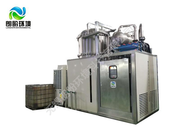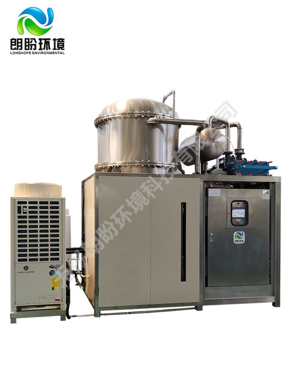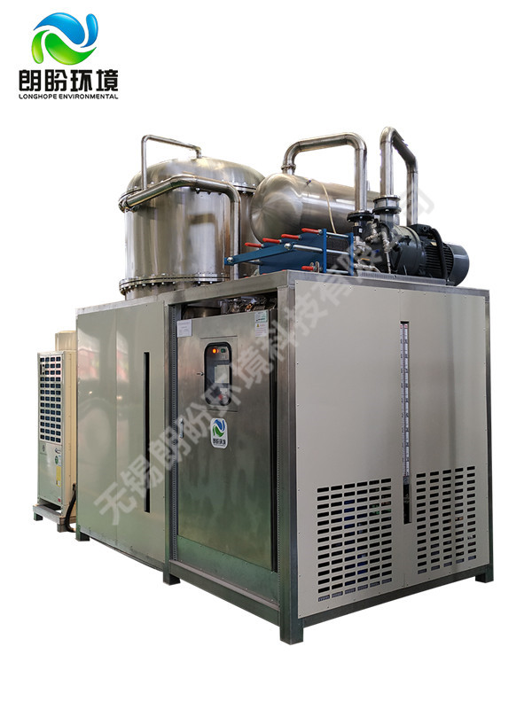 低溫蒸發(fā)結(jié)晶器的原理是物料的沸點隨著壓強的降低而降低。低溫節(jié)能濃縮設(shè)備整體保持真空狀態(tài),蒸發(fā)室的真空度約為95%~97%,在此壓強下水的沸點為35℃~37℃,系統(tǒng)無需配備進料泵,利用蒸發(fā)室的負(fù)壓將物料吸進蒸發(fā)室,通過強制循環(huán)方式將物料循環(huán)霧化,傳輸至換熱器上,物料中水分被蒸發(fā),物料連續(xù)循環(huán)霧化,通過蒸發(fā)室液位自動補料,濃度達到要求后作為濃縮液排出設(shè)備。濃縮液一般粘度較大,需采用泵抽出。