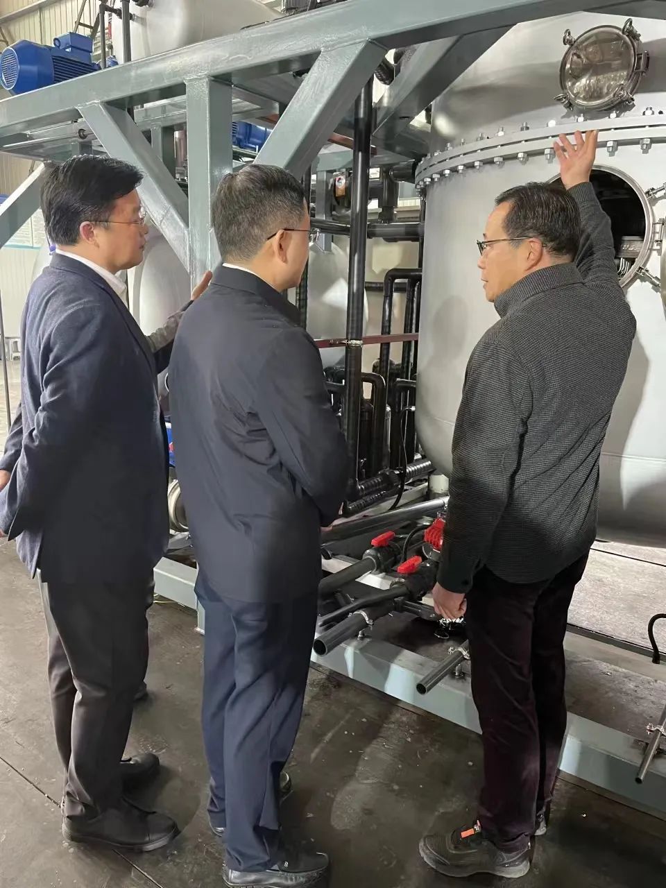 巡查工作結束后,孫海東查看了朗盼環境自主研發的低溫熱泵真空蒸發器。鮑偉東向其介紹了公司產品的應用領域、發展現狀以及發展規劃。鮑偉東說:低溫熱泵真空蒸發器是朗盼環境自主研發的工業污廢水處理環保設備,產品應用領域廣泛,包括各大金屬加工、機械加工、垃圾滲濾液、印刷印染、化工制藥等行業的工業廢水。我司在工業污廢水處理領域積累了豐富的技術沉淀和經驗,未來很期待與無錫市各大工業生產企業展開有深度的合作,為構建我市的綠色低碳環保的現代產業體系貢獻企業力量。