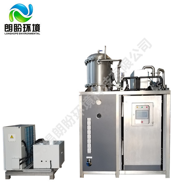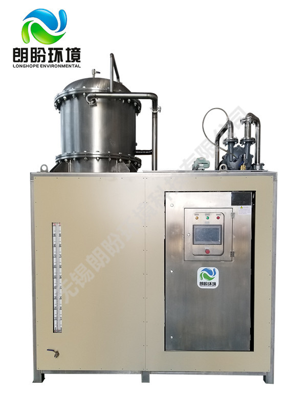 • 低溫節能濃縮設備的原理是物料的沸點隨著壓強的降低而降低。低溫節能濃縮設備整體保持真空狀態,濃縮室的真空度約為95%~97%,在此壓強下水的沸點為35℃~37℃,系統無需配備進料泵,利用蒸發室的負壓將物料吸進蒸發室,通過強制循環方式將物料循環霧化,傳輸至換熱器上,物料中水分被蒸發,物料連續循環霧化,通過蒸發室液位自動補料,濃度達到要求后作為濃縮液排出設備。濃縮液一般粘度較大,需采用泵抽出。